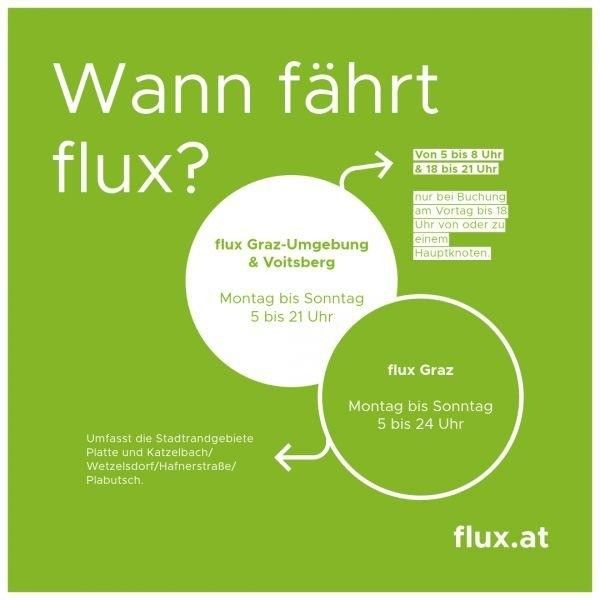 Achte beim Buchen deiner flux.fahrt aber auf die unterschiedlichen Betriebszeiten in flux Graz-Umgebung & Voitsberg und flux Graz.